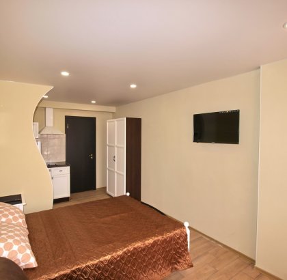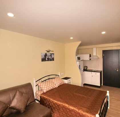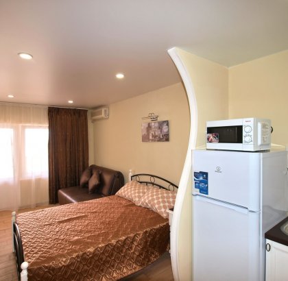 Номер люкс-студия 2+2 с дизайнерским ремонтом включает в себя четыре зоны: